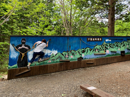 忍者の気分で戸隠連邦を飛び越えることのできる壁のアスレチックなど